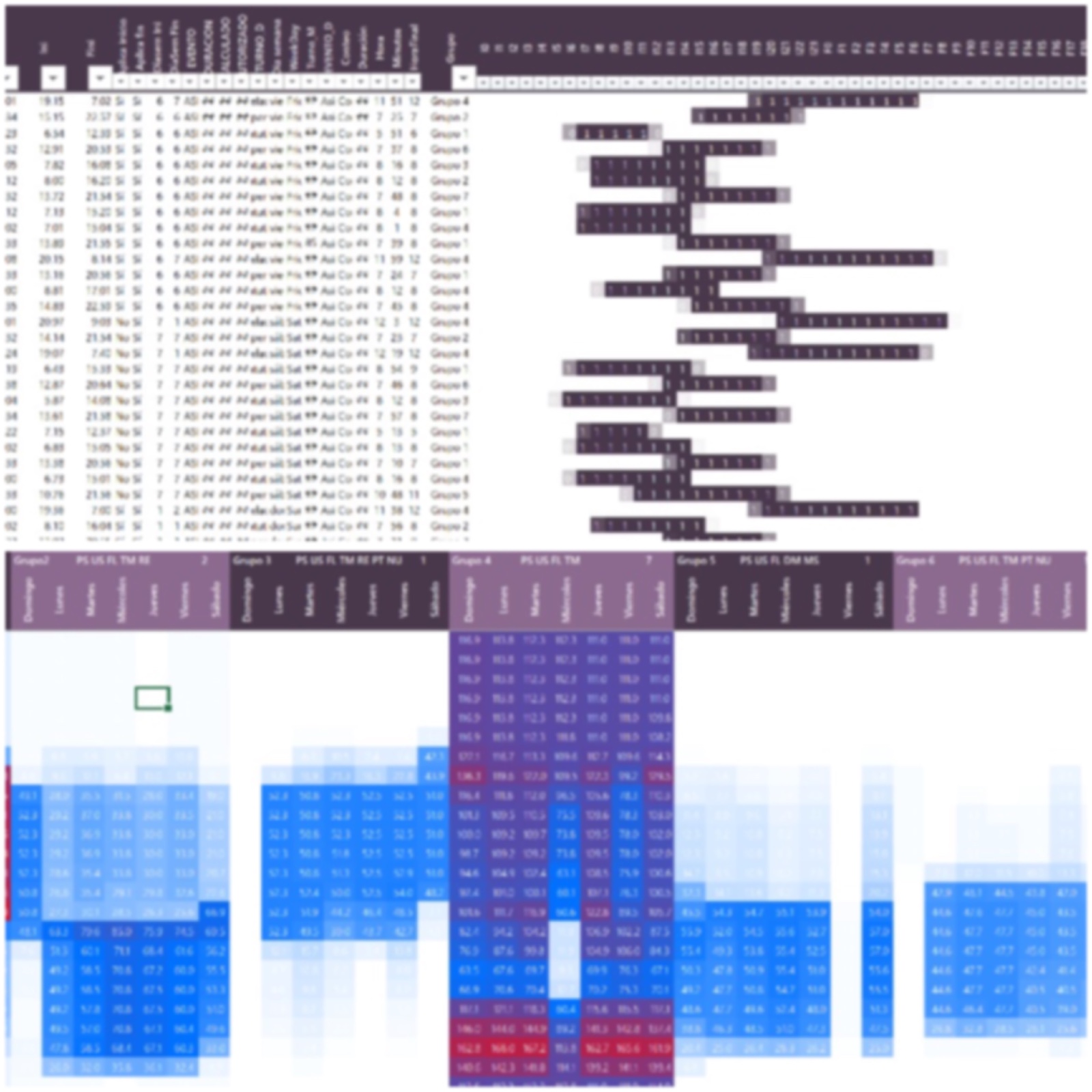 Luego, procedí a organizar los datos para ingresarlos en Solver, con el objetivo de minimizar el tiempo de sobredemanda por hora, bajo la restricción de que fuera igual o mayor a cero. Esto implicó minimizar 168 filas para obtener el resultado más óptimo posible. Después de minimizar la suma de las sobredemandas de cada especialidad, reacomodé los datos proporcionados por Solver a nuestro formato. Así, logré simular el tiempo utilizado por los técnicos para cubrir la demanda y determinar en qué casos no fue suficiente.