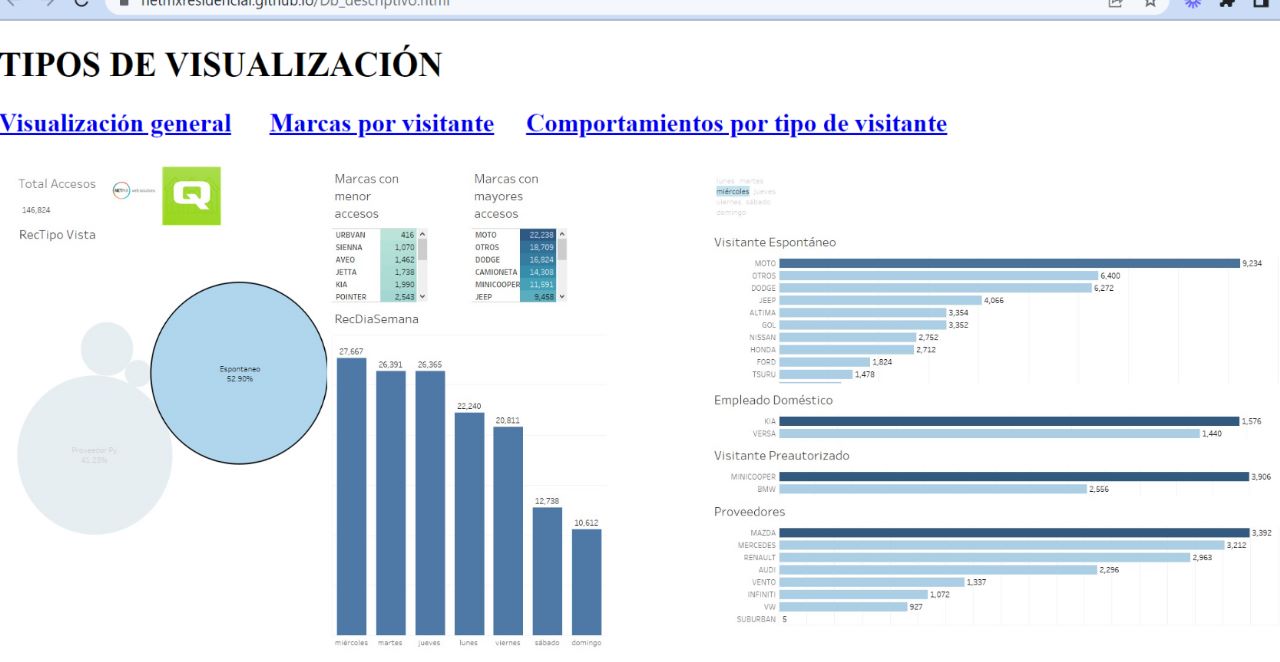 Finalmente, concluí que era necesario mejorar la extracción de los datos, ya que tal y como están las bases de datos, es prácticamente imposible utilizarlas para obtener información útil. A pesar de esto, con la información recopilada y el análisis realizado, pudimos plasmar todos los resultados en la página web creada, como se puede observar en las imágenes. Además, se presentaron recomendaciones a NetMx basadas en la información recopilada. En particular, se sugirió ajustar los lugares de estacionamiento para tener más cajones, ya que estaban diseñados para camionetas y sedanes grandes, mientras que la tendencia actual es utilizar autos compactos. También se identificó que los visitantes espontáneos representan un gran porcentaje, por lo que se recomienda hacer análisis de series de tiempo (ya con los datos recopilados de manera ajustada) para prever el número de visitantes esperados y tomar medidas en consecuencia.
